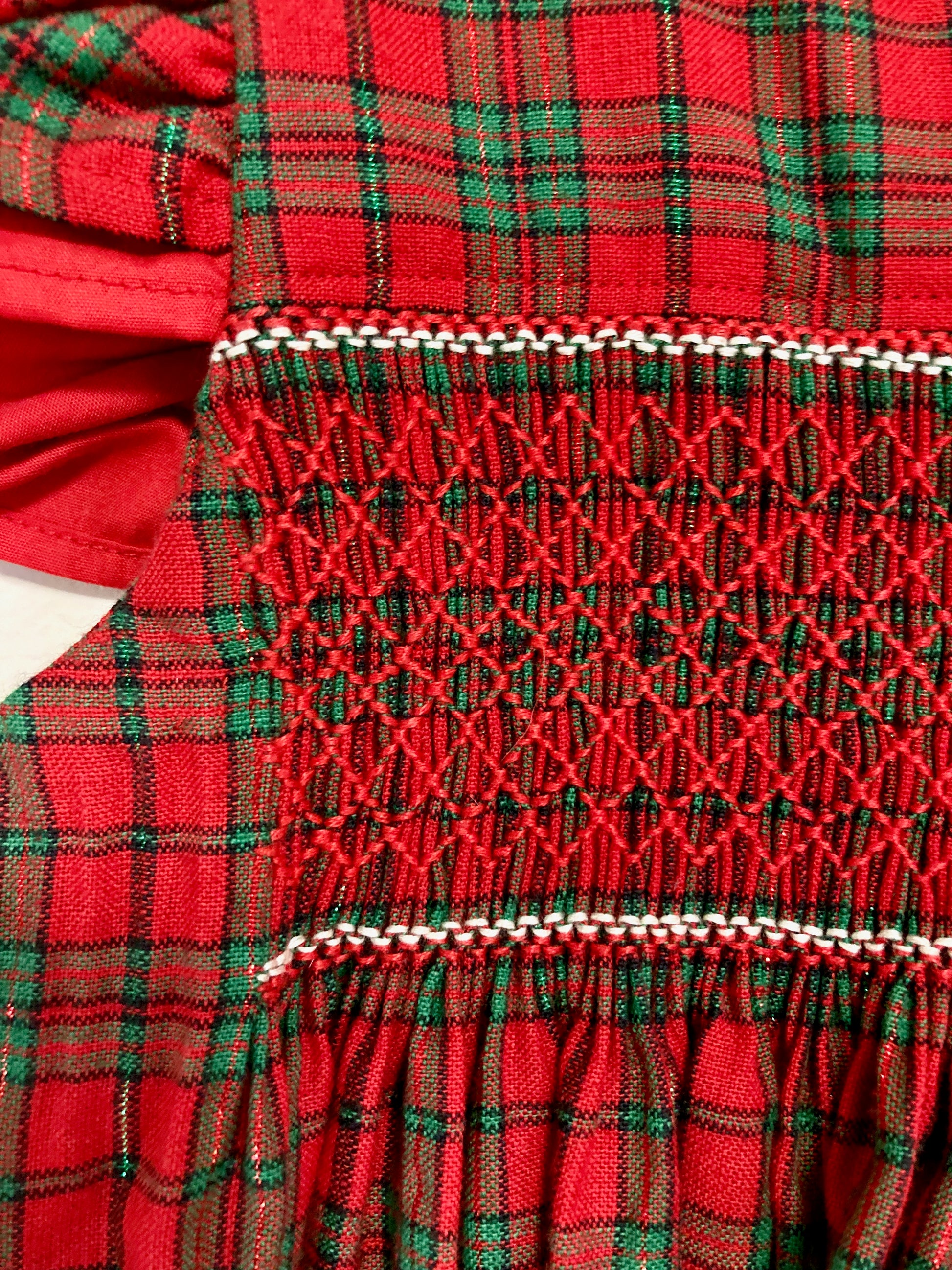 - Front is hand smocked with red cotton in diamond patterns with white borders at top and bottom