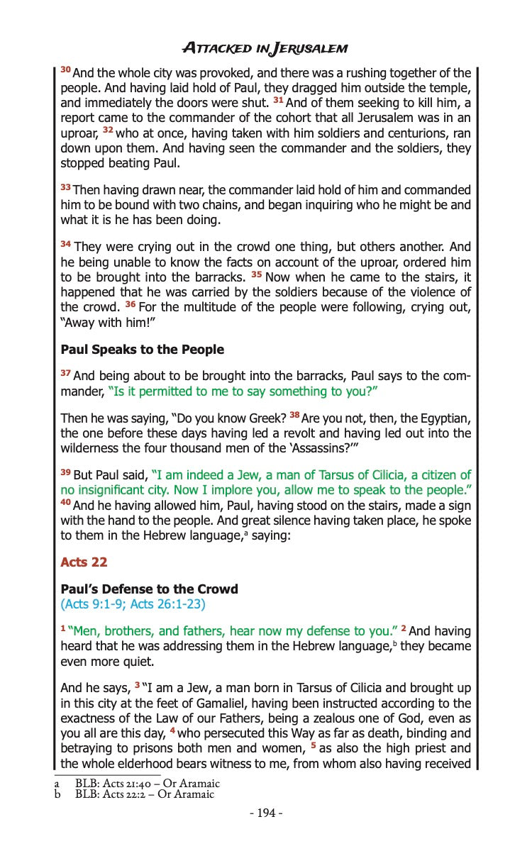- Scripture text colour coded: words of Jesus in red, words of Paul in green, chapter and verse numbers in brown, cross references in blue