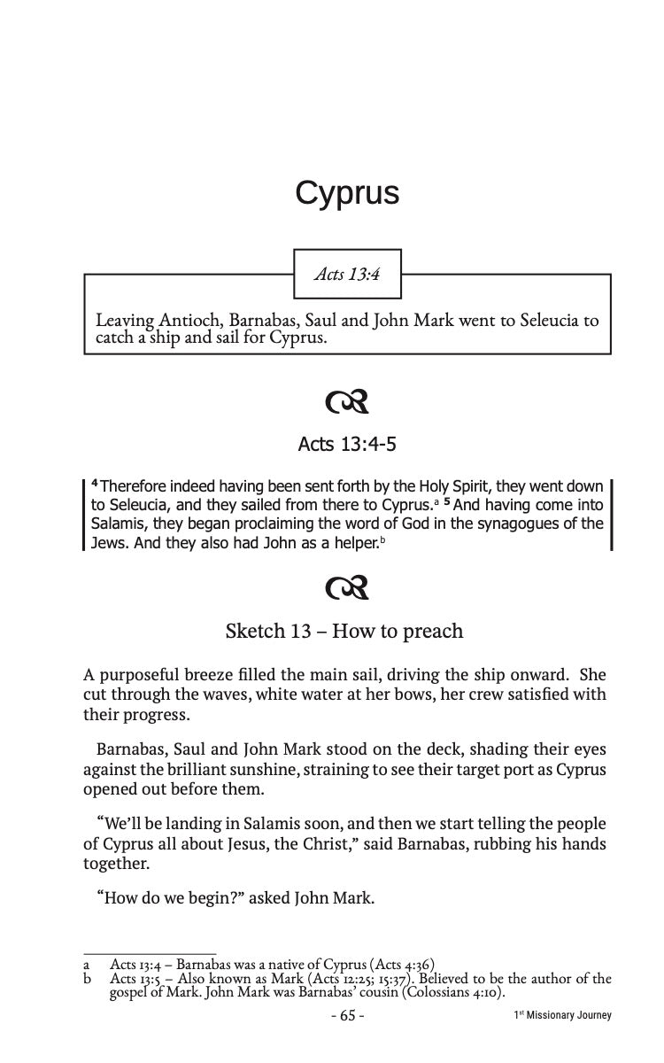 This book takes up the challenge of presenting such widely-varying information in a format that makes a reader feel at home. "Upside Down with Paul" is designed to make it easy for a reader to feel engrossed while mulling over the life of one of the most important men in the Bible. The internals of printed books are all in black and white (see two sample pages above), while eBooks use colour in the text of Acts as shown in the other two example pages above.
